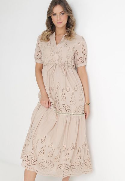 Beżowa Haftowana Sukienka Maxi ze Ściągaczem w Talii Erlina