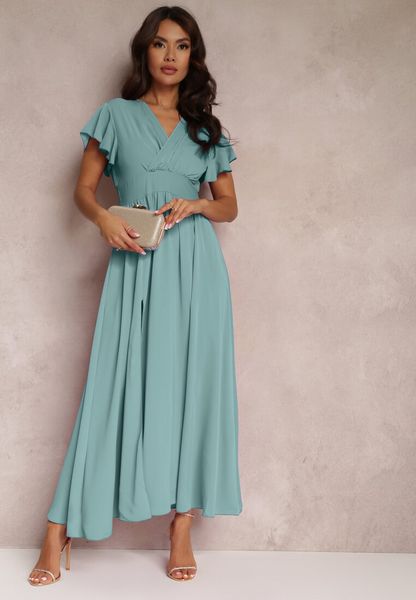 Miętowa Sukienka Rozkloszowana z Rozcięciem i Kopertowym Dekoltem Jozlyn