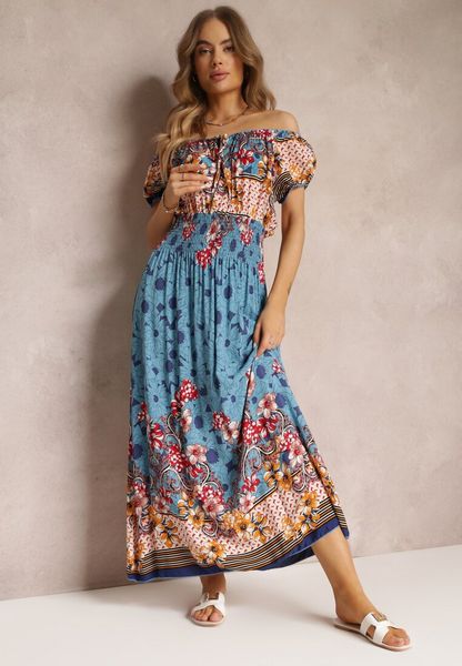 Niebieska Bawełniana Sukienka z Gumkami w Pasie i Hiszpańskim Dekoltem Laenianna