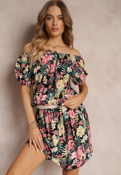 Czarno-Różowa Wiskozowa Sukienka Mini w Kwiaty z Hiszpańskim Dekoltem i Gumką w Talii Selecia