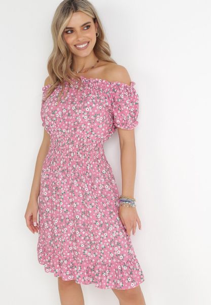 Różowa Bawełniana Sukienka Hiszpanka w Kwiaty z Marszczoną Gumką w Talii Rosaliya
