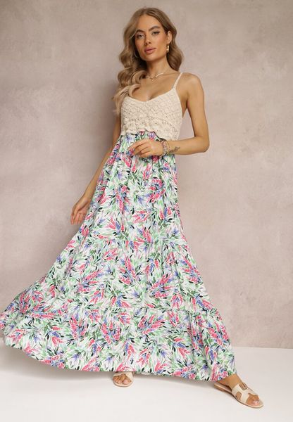 Zielona Kwiecista Sukienka Maxi z Szydełkową Górą i Cienkimi Ramiączkami z Wiskozy Zanidora