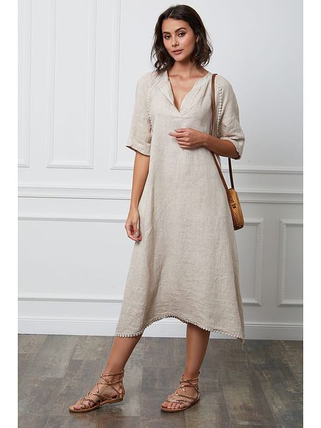 – czysty len- dekolt: z rozcięciem- zakończenie rękawa: podwijane- kieszenie: wpuszczane- detale: szydełkowana koronka- krój: luźny- look: jednokolorowy
