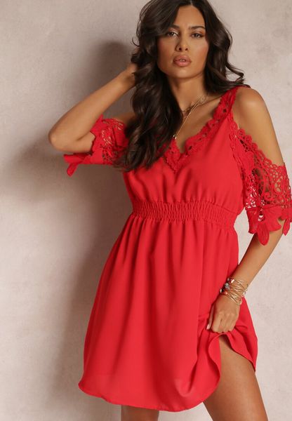 Czerwona Rozkloszowana Sukienka Mini z Gumką w Talii i Hiszpańskimi Rękawami z Koronką Carolta