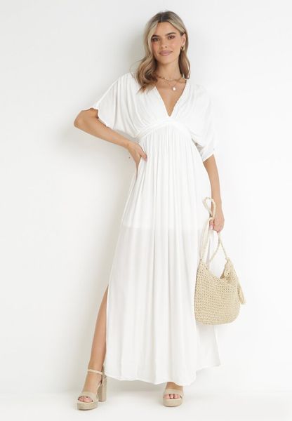 Biała Wiskozowa Sukienka Maxi Nietoperz z Głębokim Dekoltem i Gumką w Pasie z Lnem Zivana