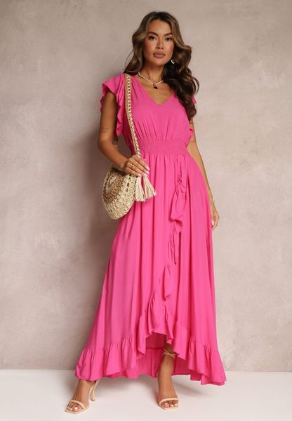 Fuksjowa Kopertowa Sukienka z Wiskozy Ozdobiona Falbanką Carnovie