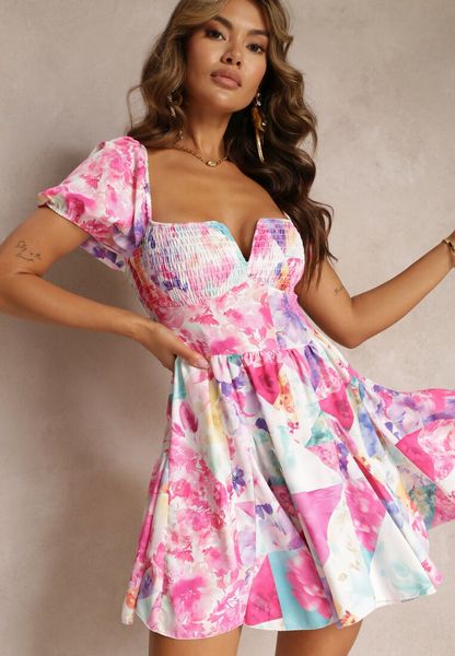 Rozkloszowana sukienka Evelilles w kwiatki. Wykonana z gładkiej tkaniny. Model z krótkimi rękawami o długości mini. Wyróżnia się gumkami wszytymi w górnej części oraz głębokim wycięciem przy dekolcie. Nie posiada podszewki. Doskonale wygląda w duecie z klapkami czy sandałami na obcasie.