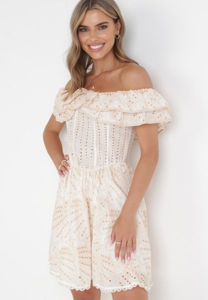 Beżowa Rozkloszowana Sukienka Mini Hiszpanka z Gumką w Pasie i Ozdobnym Haftem Lenia