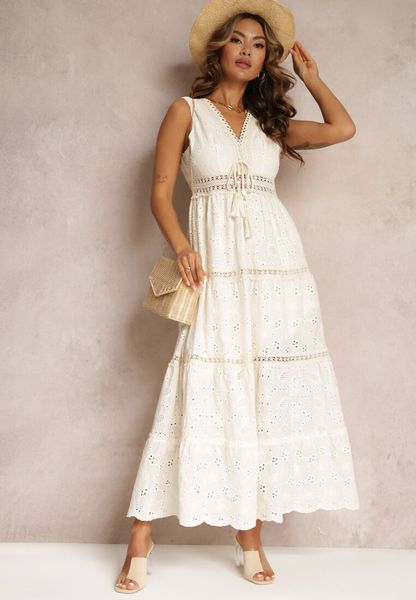 Sukienka Jive o długości maxi, wykonana z haftowanej tkaniny. Dół zakończony delikatną falbanką. Przy dekolcie dekoracyjne sznurki z chwostami i koralikami. Posiada elastyczną podszewkę. Z tyłu wszyte cienkie, marszczone gumki.