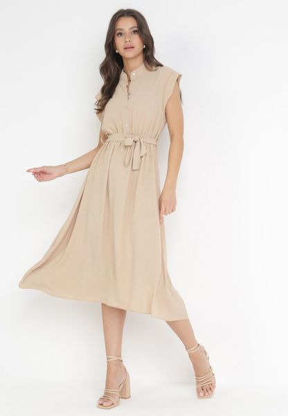 Beżowa Midi Sukienka Zapinana na Guziki z Wiązanym Paskiem Alyssama
