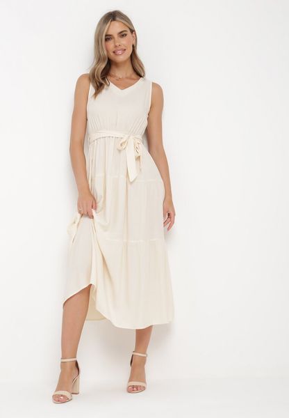 Beżowa Wiskozowa Sukienka Midi z Gumką w Pasie i Materiałowym Paskiem Bicuh