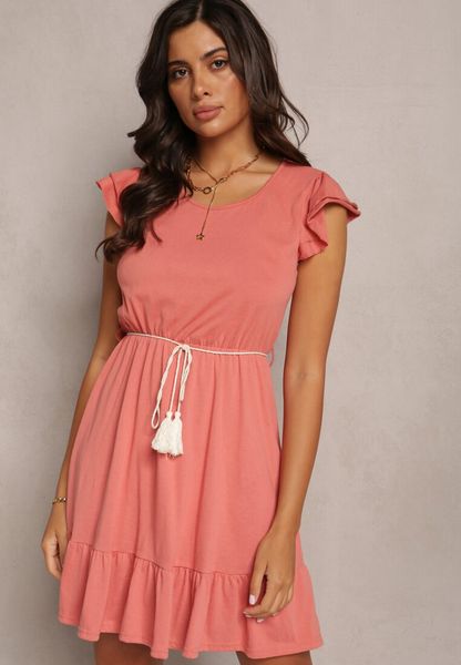 Jasnoczerwona Sukienka o Rozkloszowanym Fasonie z Bawełny Ozdobiona Falbankami Kadan