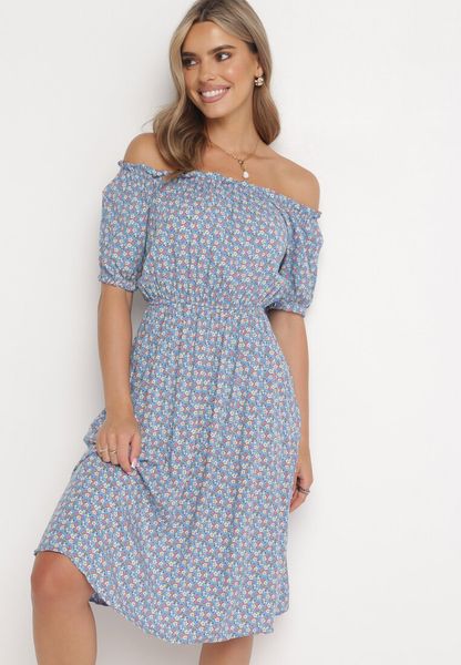 Niebieska Sukienka Wiskozowa z Hiszpańskim Dekoltem i Gumką w Talii Masandrt
