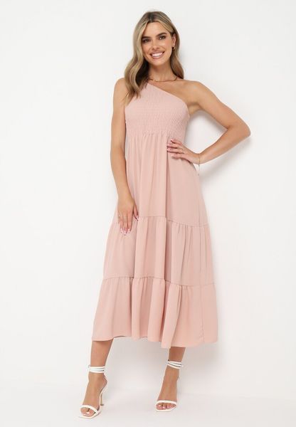 Różowa Maxi Sukienka Asymetryczna o Rozkloszowanym Kroju na Jedno Ramię Byrecl