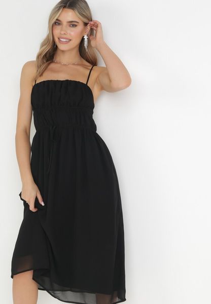 Czarna Rozkloszowana Sukienka Midi na Cienkich Ramiączkach z Wiązaniem w Talii Tessonne