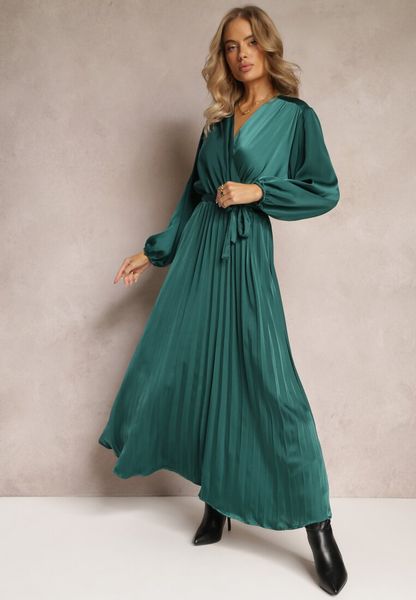 Zielona Maxi Sukienka z Plisowanym Dołem i Kopertowym Dekoltem Basila