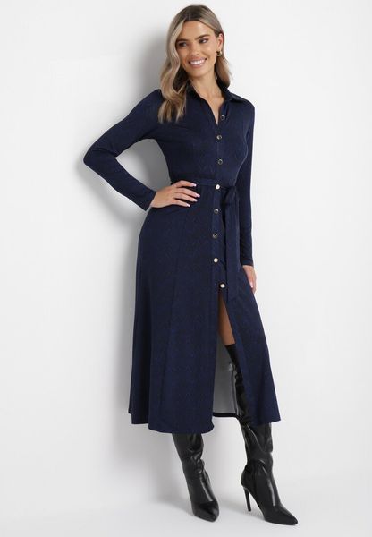 Granatowa Rozkloszowana Sukienka Koszulowa z Wiązanym Paskiem Cheresin