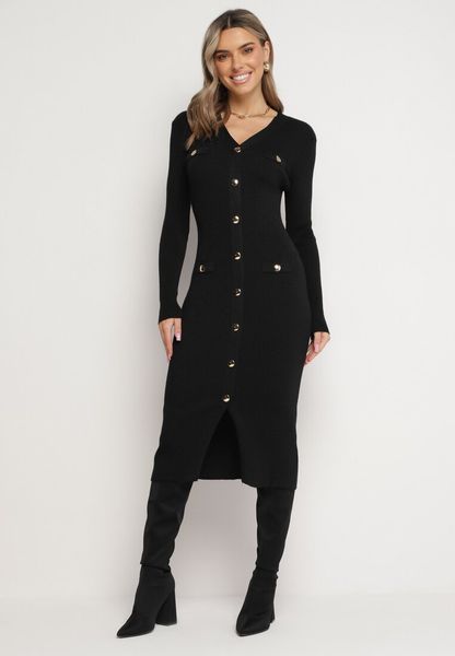 Sukienka Umiose o długości midi i dopasowanym fasonie. Sweterkowy fason, wykonana z dzianinowej tkaniny z metaliczną nitką. Z przodu ozdobne guziki i imitacja kieszeni.