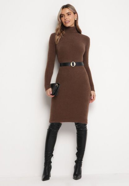 Brązowa Sweterkowa Puchata Sukienka Midi z Wełny z Golfem Sebhat