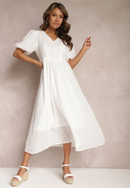 Biała Rozkloszowana Sukienka Haftowana Maxi z Krótkim Rękawem Garneta