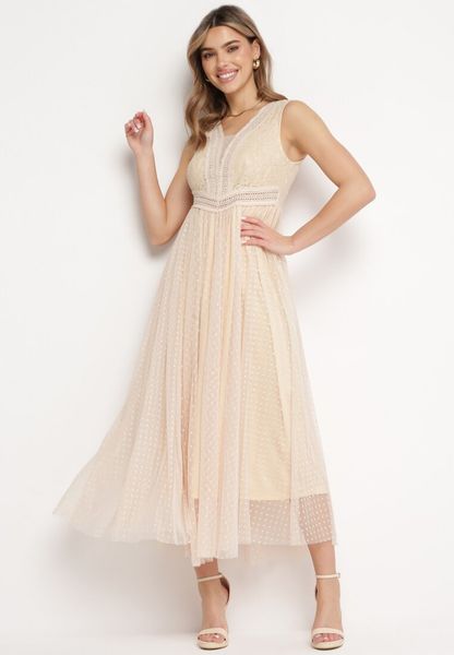 Beżowa Rozkloszowana Sukienka Maxi z Koronkową Górą i Tiulowym Dołem Gelivia