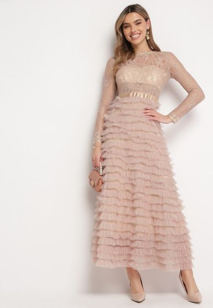Beżowa Maxi Sukienka Rozkloszowana z Koronkową Górą i Tiulowymi Falbankami Firina