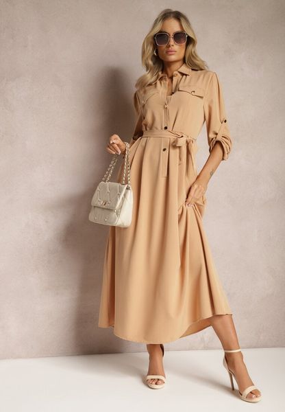 Beżowa Długa Sukienka z Rozkloszowanym Dołem i Koszulową Górą Kitesi