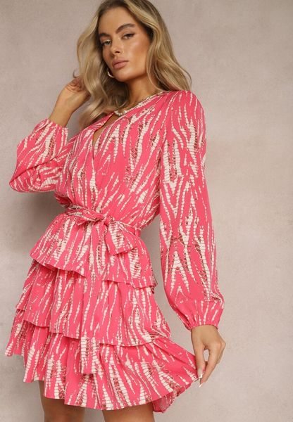 Różowa Rozkloszowana Sukienka Mini z Paskiem i Falbankami w Abstrakcyjny Wzór z Kopertowym Dekoltem Varniema