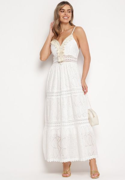 Bawełniana sukienka maxi na cienkich regulowanych ramiączkach. Wykonana z haftowanej tkaniny, dekolt ozdobiony frędzlami i muszelkami. Z tyłu wszyte cienki gumki, elastyczna podszewka. Zabierz ją na wakacje!