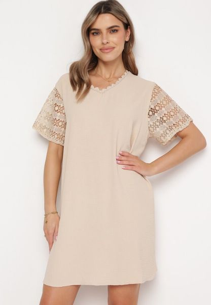 Beżowa Sukienka Mini Pudełkowa z Koronką na Ramionach i Dekolcie Idalyn