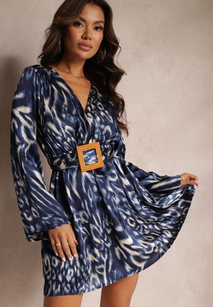 Granatowo-Niebieska Rozkloszowana Sukienka Mini z Kopertowym Dekoltem i Paskiem Liisatta