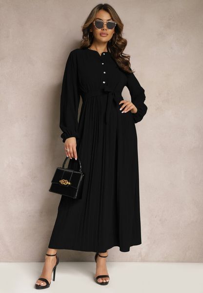 Czarna Rozkloszowana Sukienka Maxi Plisowana Wiązana w Pasie Terilla