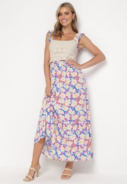 Rozkloszowana sukienka Jamiliana maxi. Góra z szydełkowym wzorem, na szerokich ramiączkach z delikatną falbanką. Z tyłu na plecach marszczona gumka.