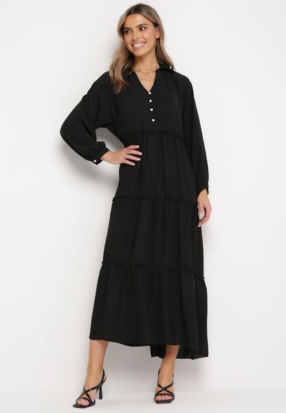 Czarna Sukienka Maxi Rozkloszowana z Kołnierzykiem i Falbankami Eweneme