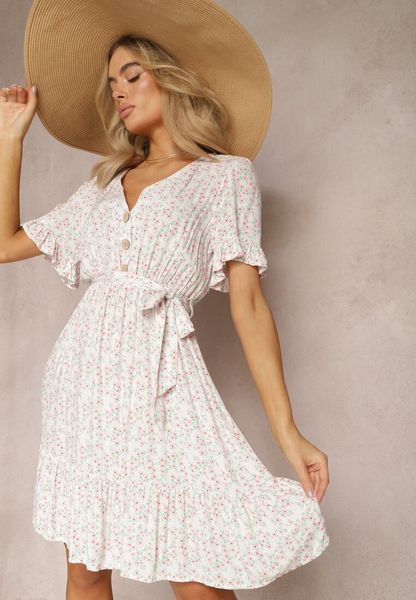 Biało-Różowa Rozkloszowana Sukienka Wiskozowa Mini w Kwiatowy Print z Falbanką Taelle