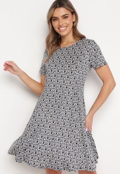 Czarno-Biała Rozkloszowana Sukienka z Wiskozy Krótkim Rękawem i Mozaikowym Printem Hyacina