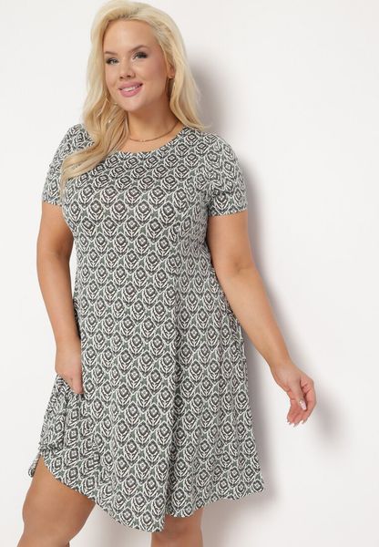 Zielono-Beżowa Rozkloszowana Sukienka z Wiskozy Krótkim Rękawem i Mozaikowym Printem Hyacina