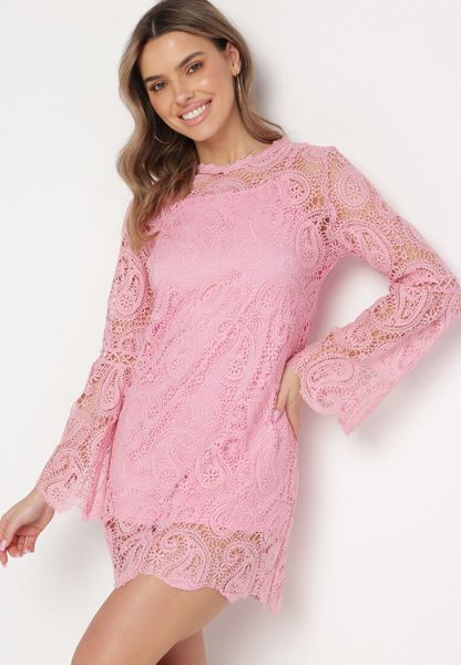 Różowa Koronkowa Sukienka Mini z Długimi Rękawami i Kokardkami Temona