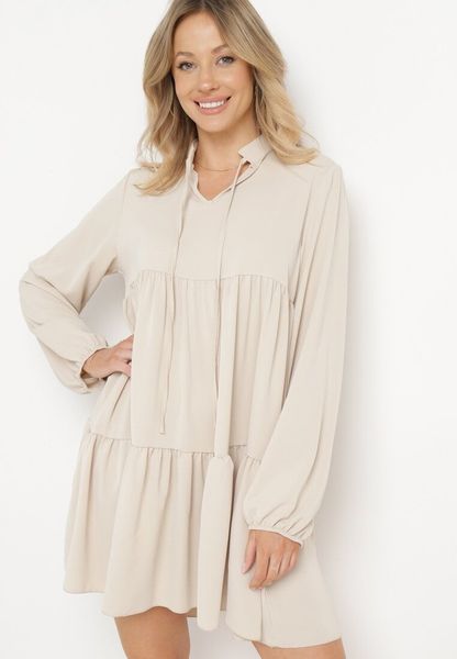 Beżowa Rozkloszowana Sukienka z Falbanką Uxaria