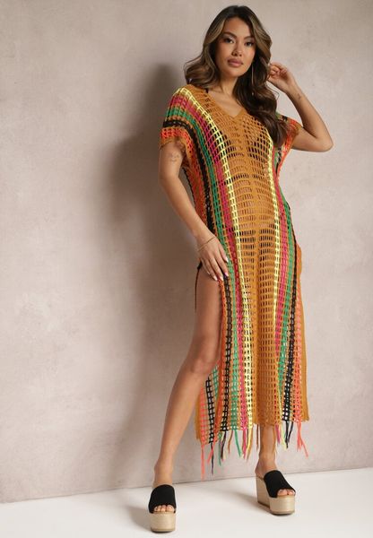 Ciemnobeżowa Długa Szydełkowa Sukienka Narzutka na Plażę w Paski z Wycięciami i Frędzlami Liretha