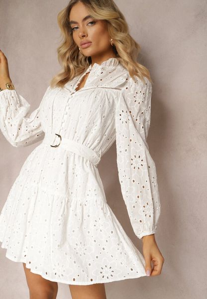 Krótka sukienka Bealiosa z długimi rękawami i subtelną stójką, wykończona ażurowymi detalami oraz paskiem podkreślającym talię to idealny wybór na letnie przyjęcia.