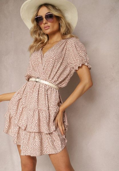 Jasnobrązowa Sukienka Ozdobiona Falbankami z Gumką w Talii i Bufiastymi Rękawkami Ornefia
