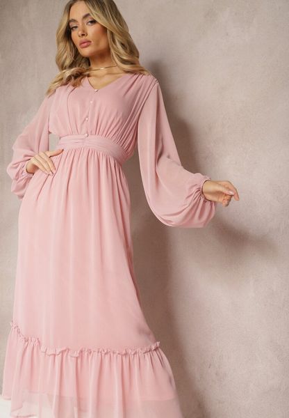 Różowa Plisowana Sukienka Koktajlowa Ozdobiona Guzikami i Falbankami Osumia