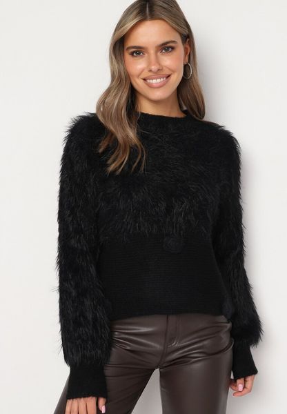 Czarny Sweter z Puszystymi Piórkami i Kwiatkami Arrgelia