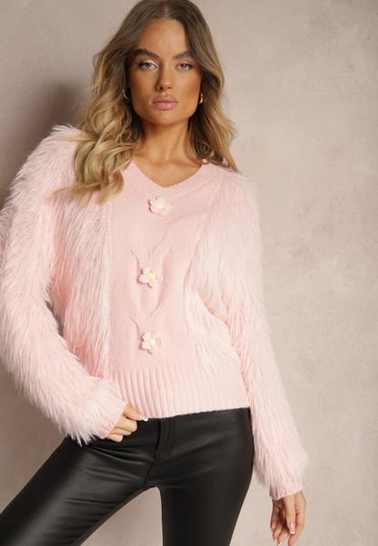Różowy Sweter z Długim Włosiem i Wełną z Guzikami w Kształcie Kwiatów Meriwine