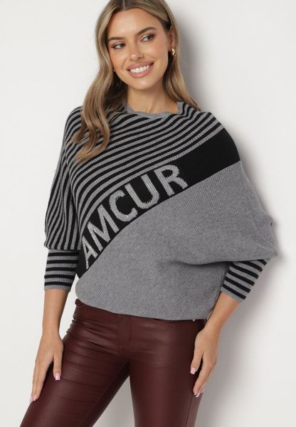 Czarno-Szary Asymetryczny Sweter w Paski z Rękawami Typu Nietoperz Riasira