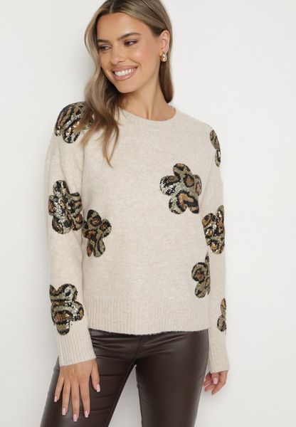 Beżowy Sweter z Kwiatowymi Naszywkami i Cekinami Ciadora