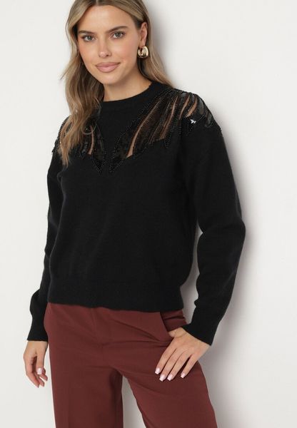 Czarny Sweter z Siateczkowymi Wstawkami z Cekinami Perełkami i Koralikami Evoriana