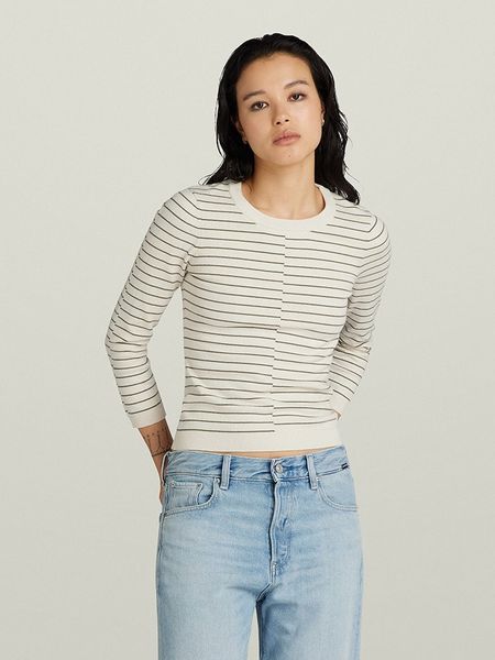 – z dodatkiem wełny- dekolt: okrągły- ściągacz: dekolt, zakończenia rękawów, dolny brzeg- krój: wąski- wzór: paski