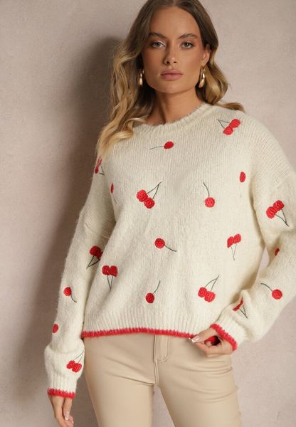 Jasnobeżowy Sweter w Wisienki z Dodatkiem Wełny Eltintia